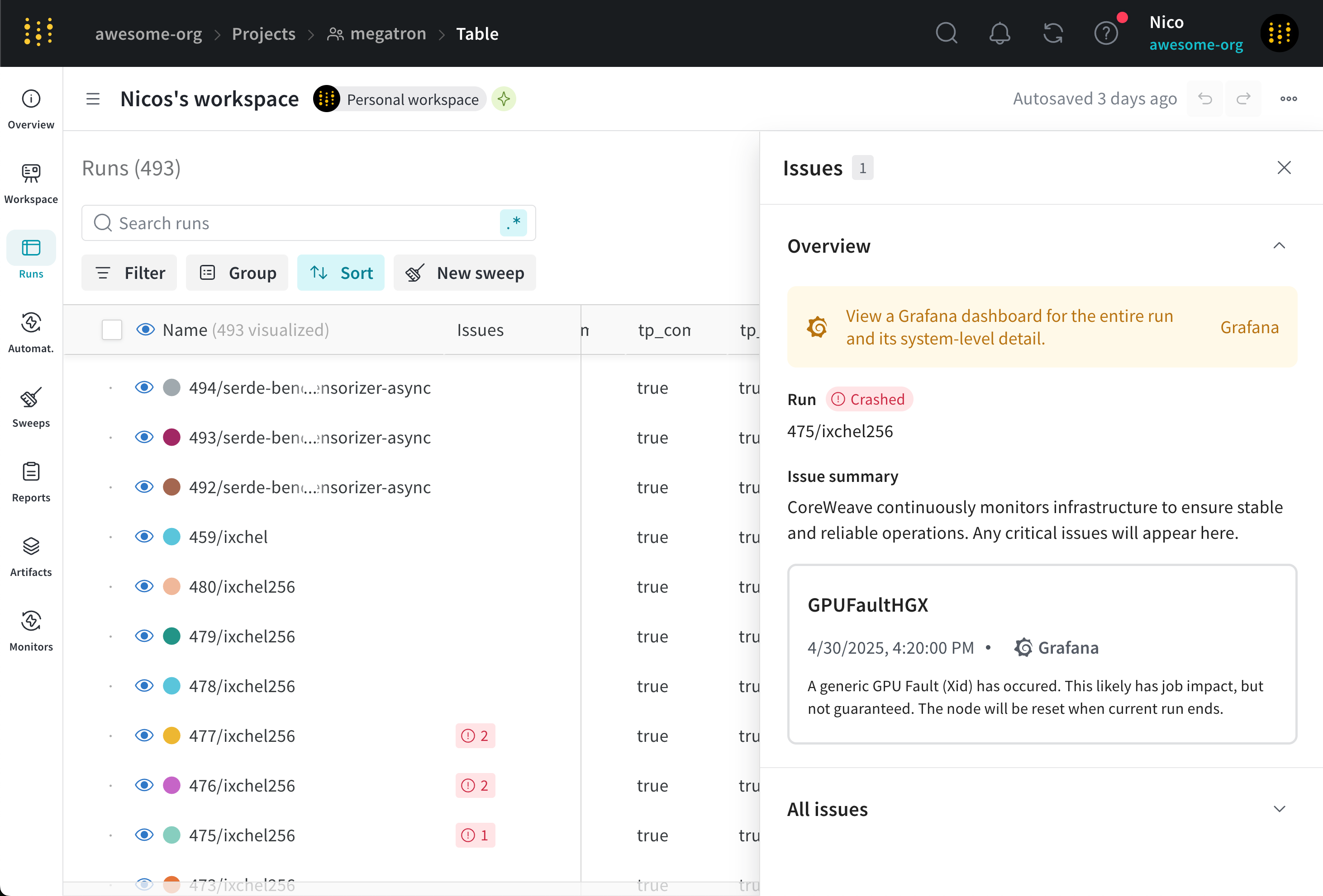 Each run that you create in W&B corresponds to a single SLURM job in CoreWeave. You can view a failed job’s Grafana dashboard or discover more information about a single node. The link within the Overview section of the Issues drawer links to the SLURM job Grafana dashboard. Expand the All Issues dropdown to view both job and node issues and their respective Grafana dashboards.